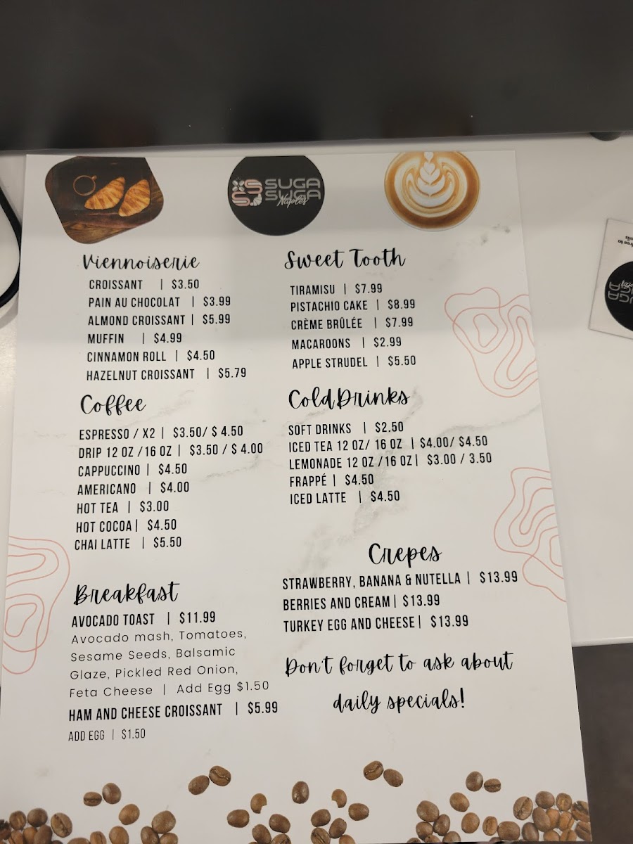 Welcome to Suga Suga Naples Cafe, a charming gem nestled in Naples, Florida, where delightful treats await. This café offers an inviting atmosphere, making it the perfect spot for breakfast or a mid-day pick-me-up. The menu features a tempting selection of Viennoserie, including flaky croissants, and the irresistible Choco Bombolone. Each pastry is freshly baked, ensuring that every bite is an experience worth savoring.